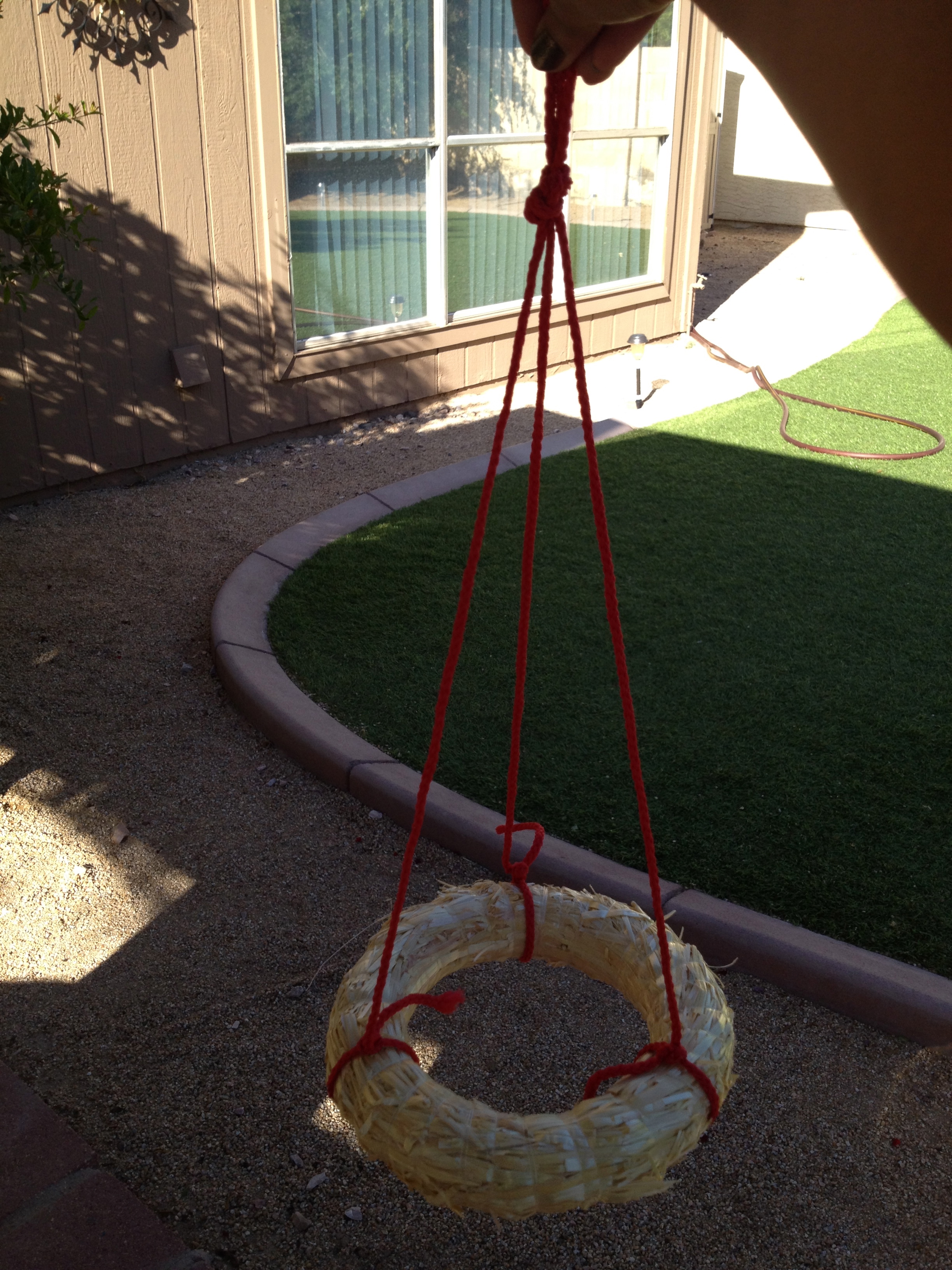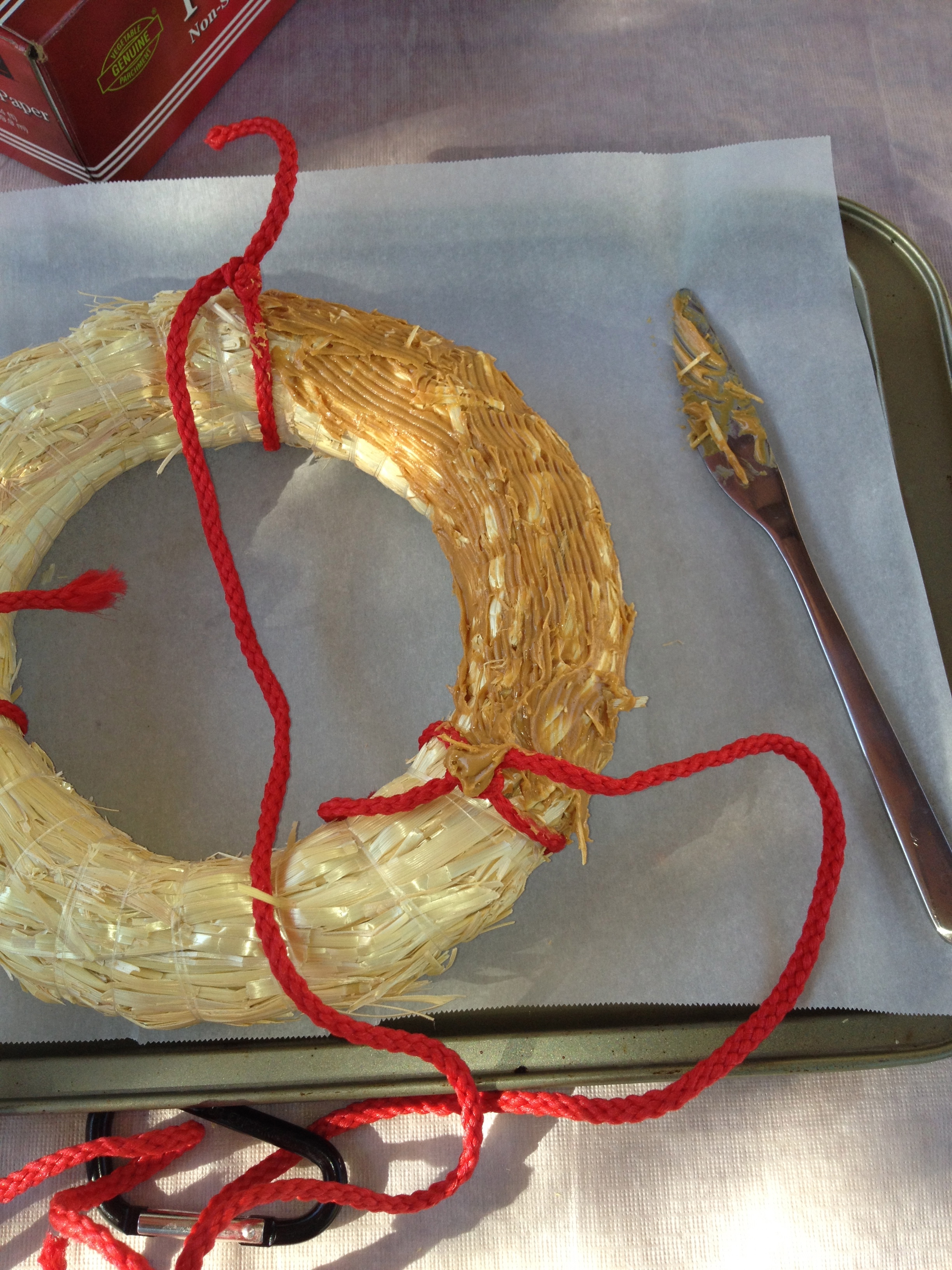 My bird feeder is made from old straw wreaths(already on hand). I got peanut butter and some bird food from the local dollar store. You can use Honey and maple syrup too. Wish I got some pictures of birds hanging on the feeder, but it was too far to take through windows.