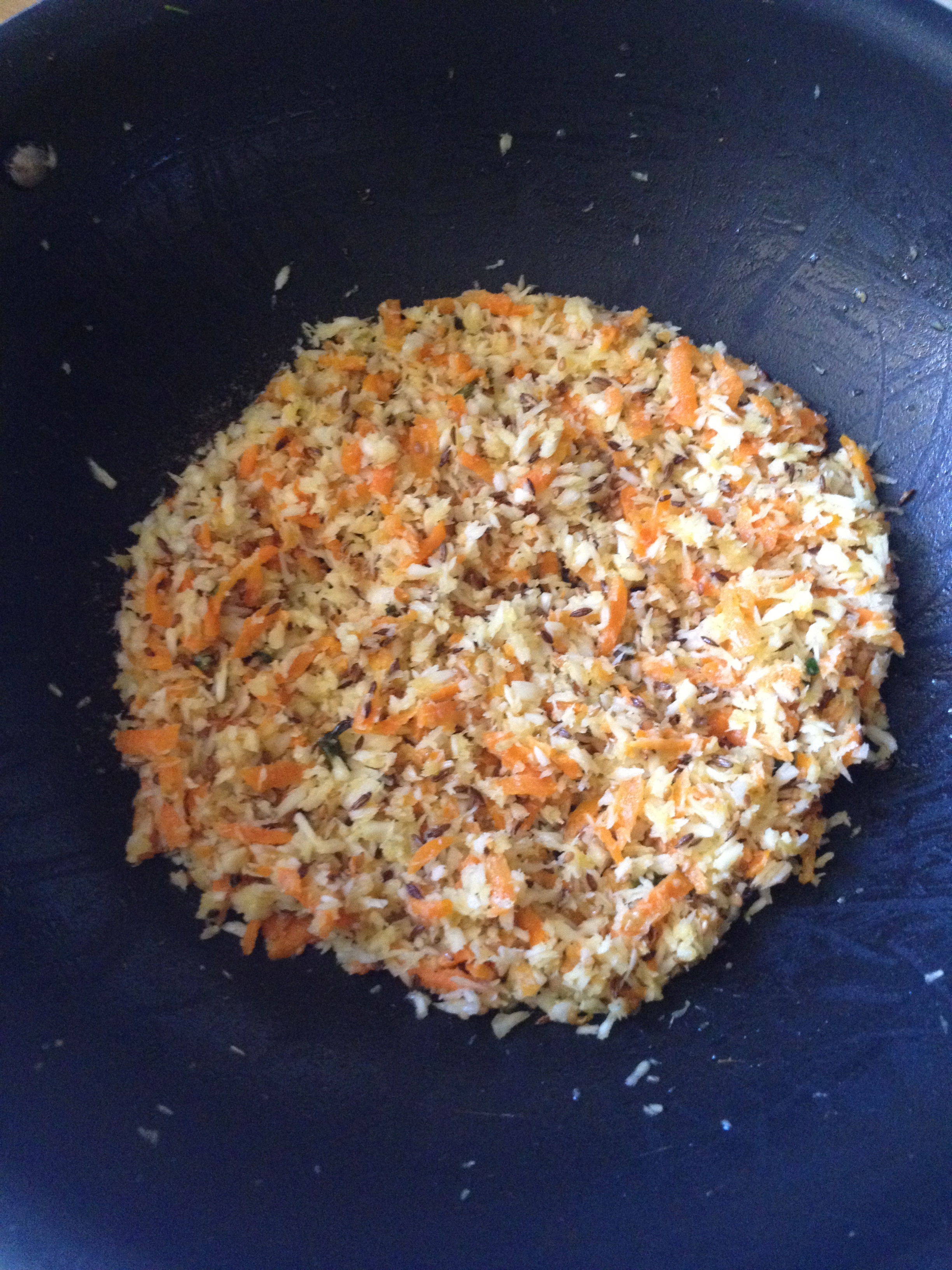 Ste p 3: Add fresh/thawed coconut and carrots and sauté for 2 minutes