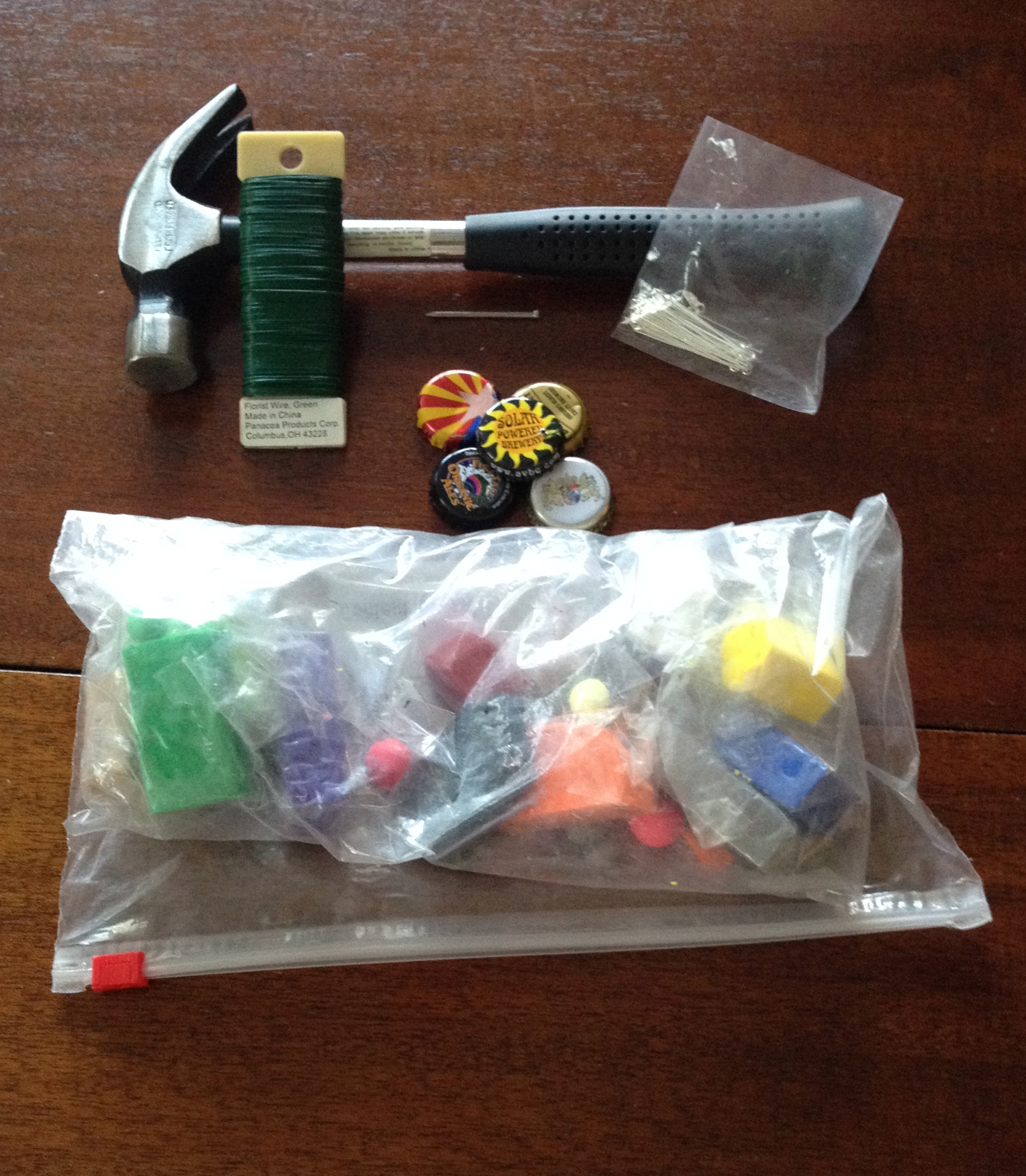 All you need is some beer caps, polymer clay scrap, hammer and nail, floral wire or jewelry eye pins and wine glass hoop.