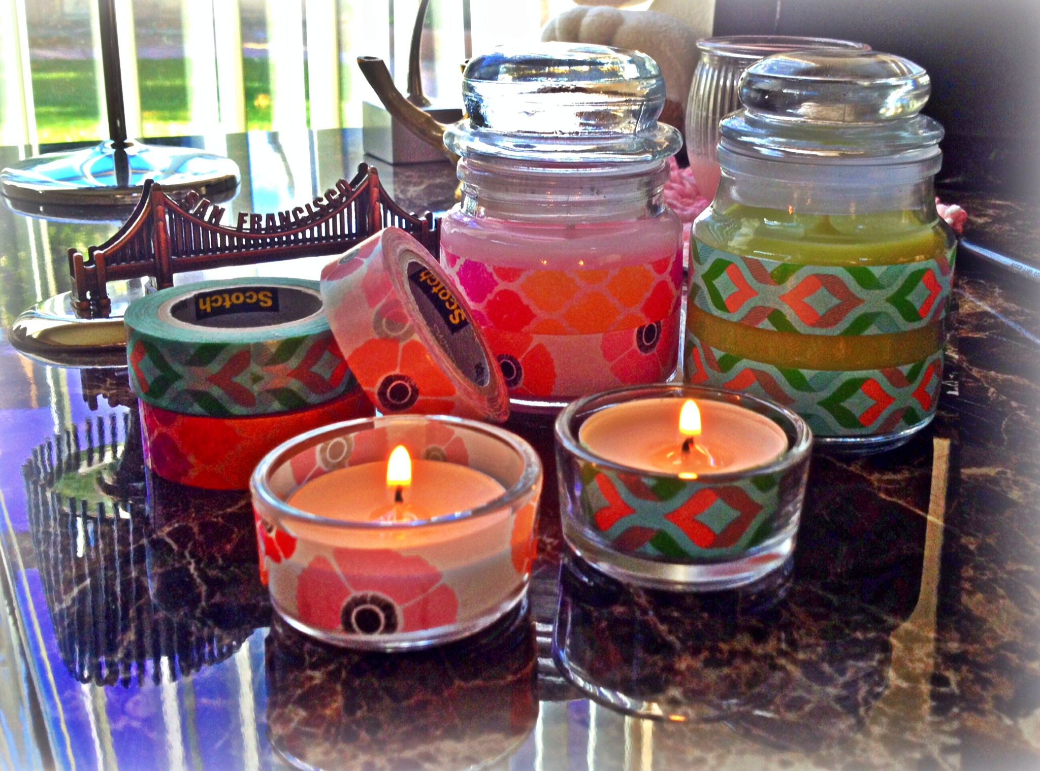 Long glasses or Wine glasses are great to use with candles. You can buy them @ dollar store or Walmart.