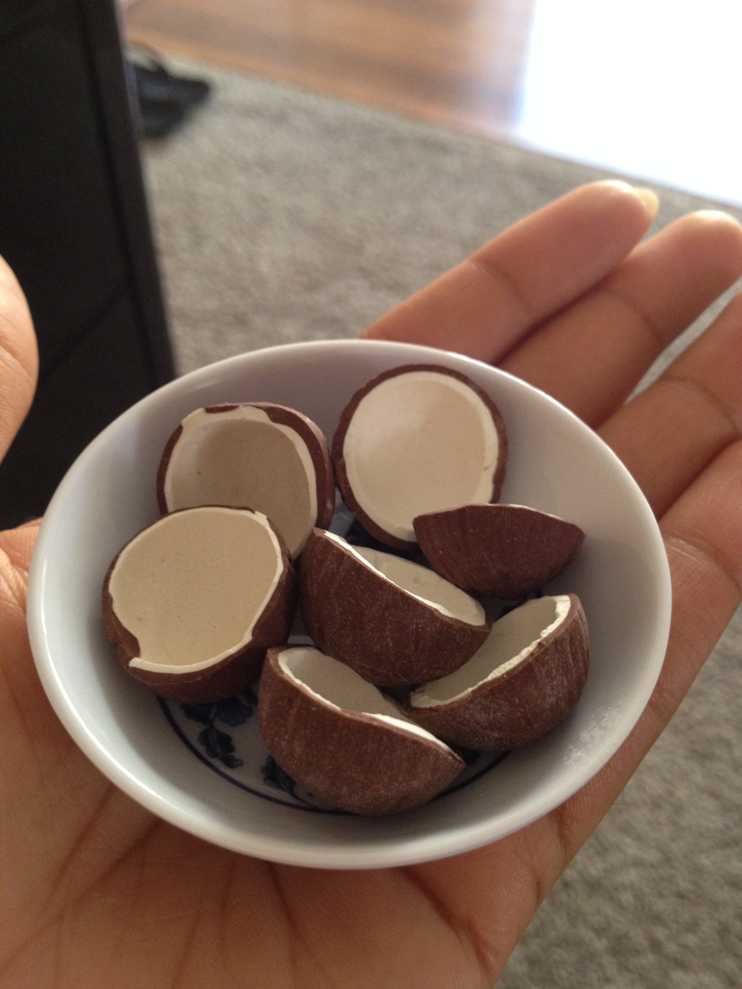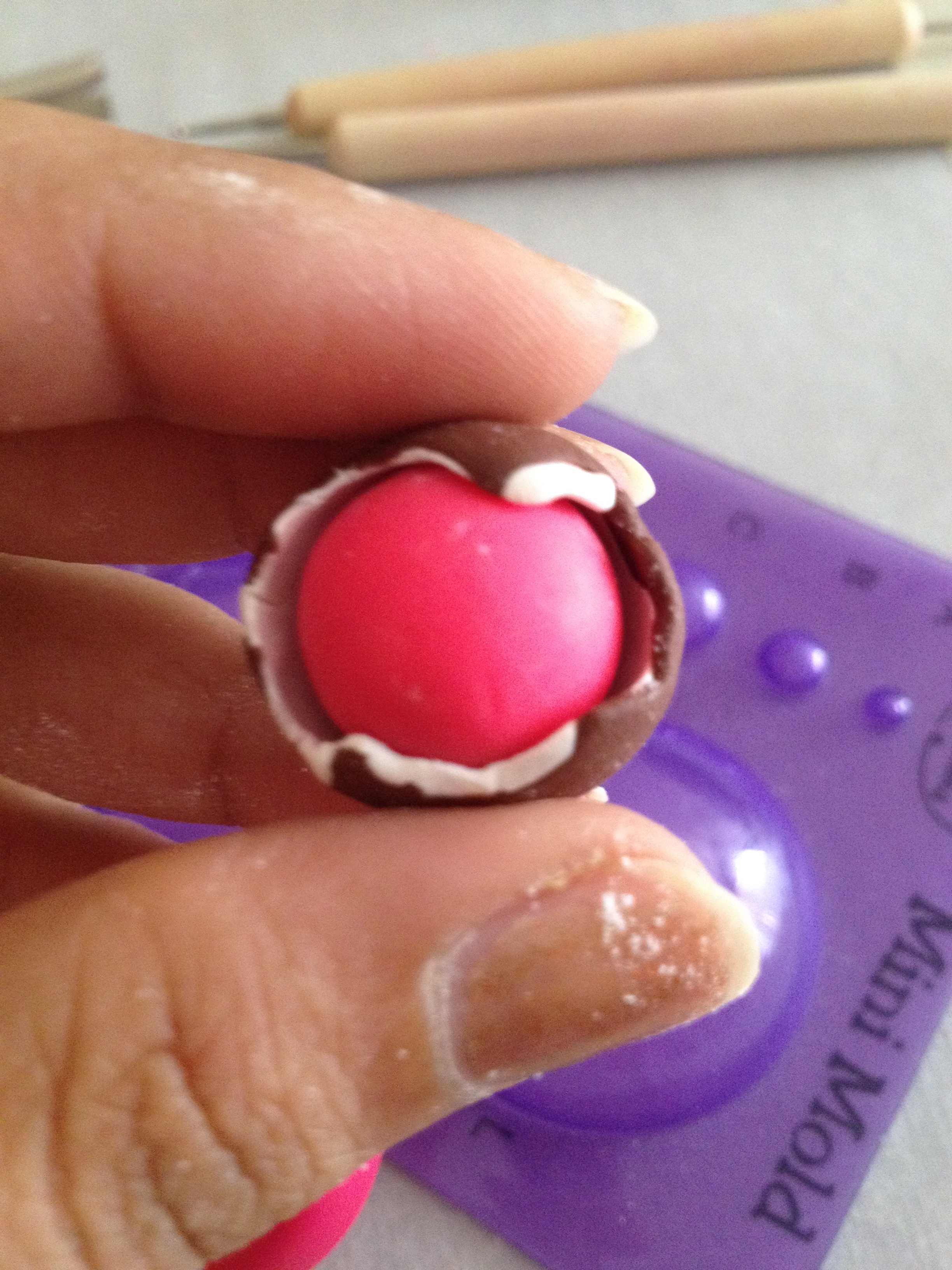 Step 2: To shape, use a marble or bake scrap clay into a tiny ball. Dip the clay ball or marble into corn/rice flour and lay the white rolled clay and cover with brown clay. Shape it as shown below.