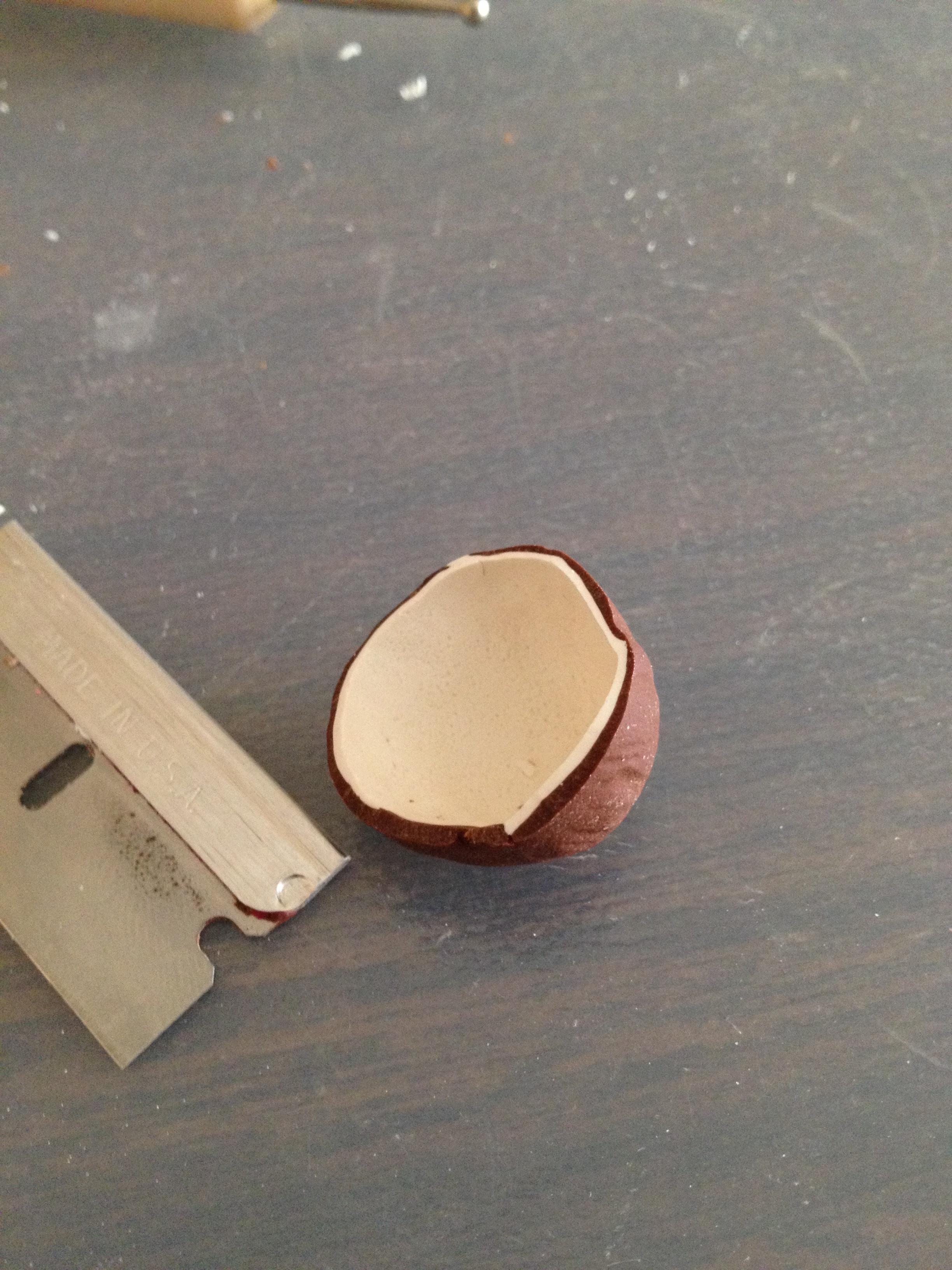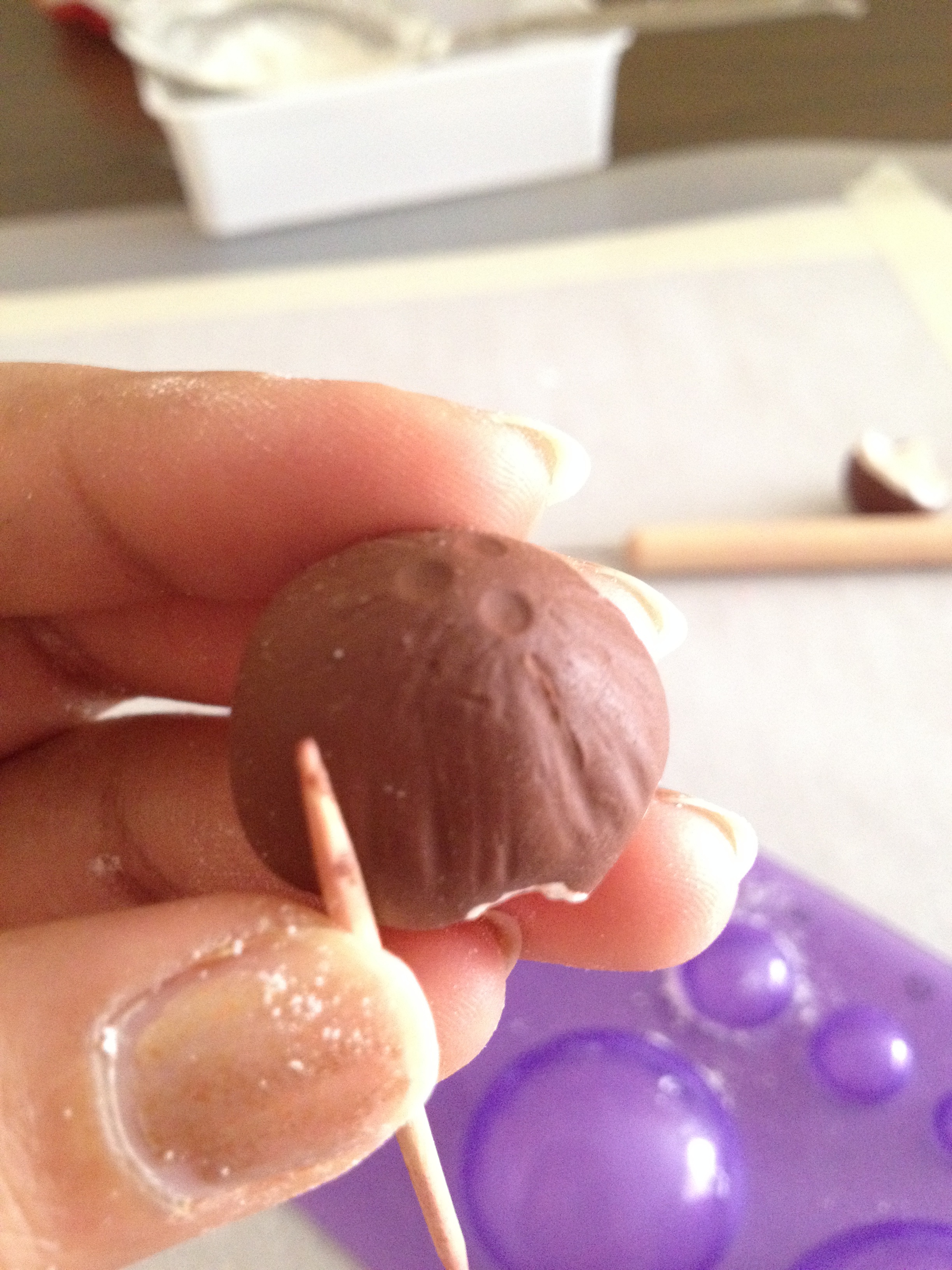 Step 3: Use a toothpick to create the coconut texture and make 3 hollows. If needed refrigerate for few mins to hold the shape.