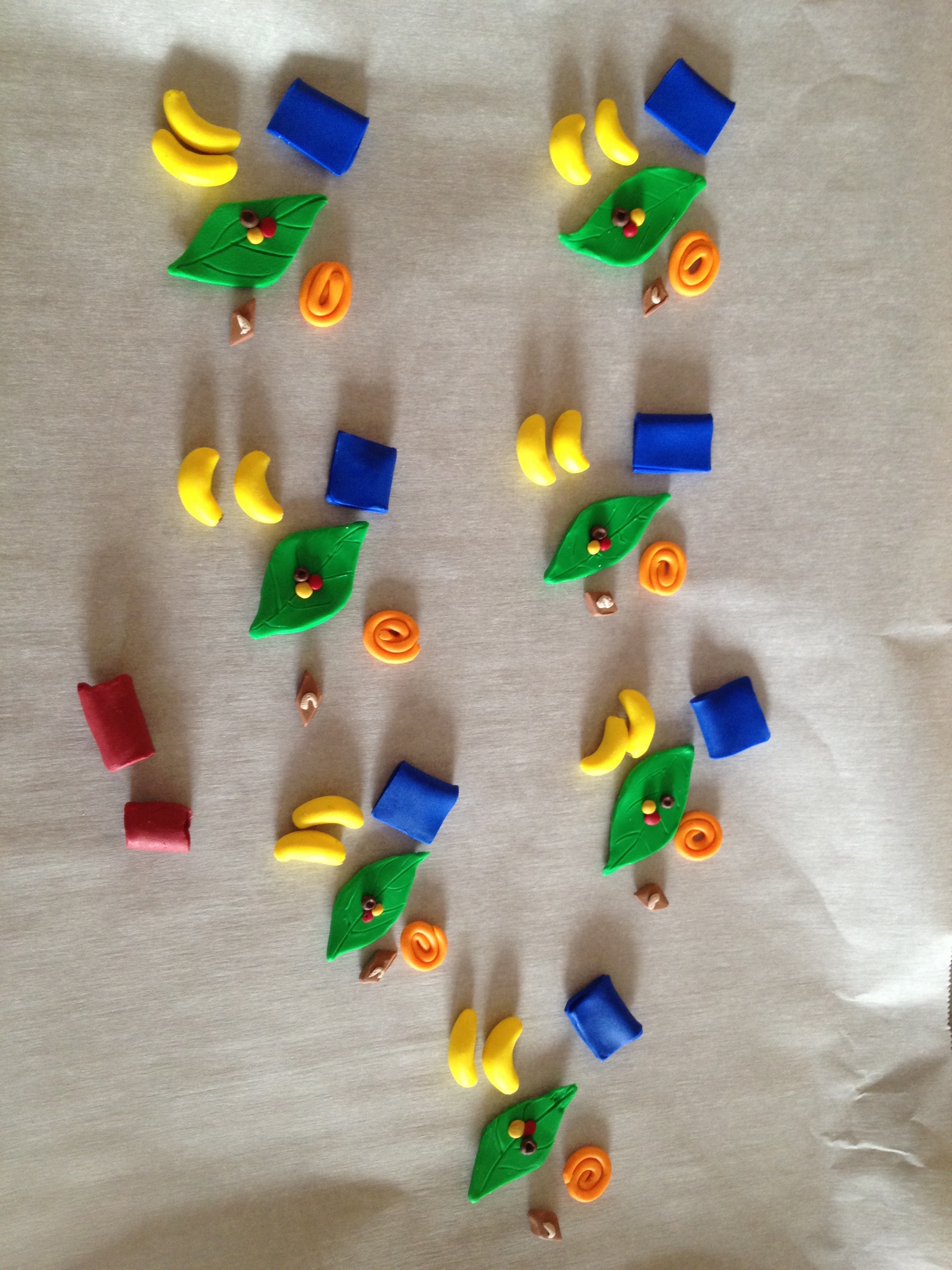 To make the miniature banana, followed a miniature fruit tutorial on youtube and made flowers with a fondant flower plunger.