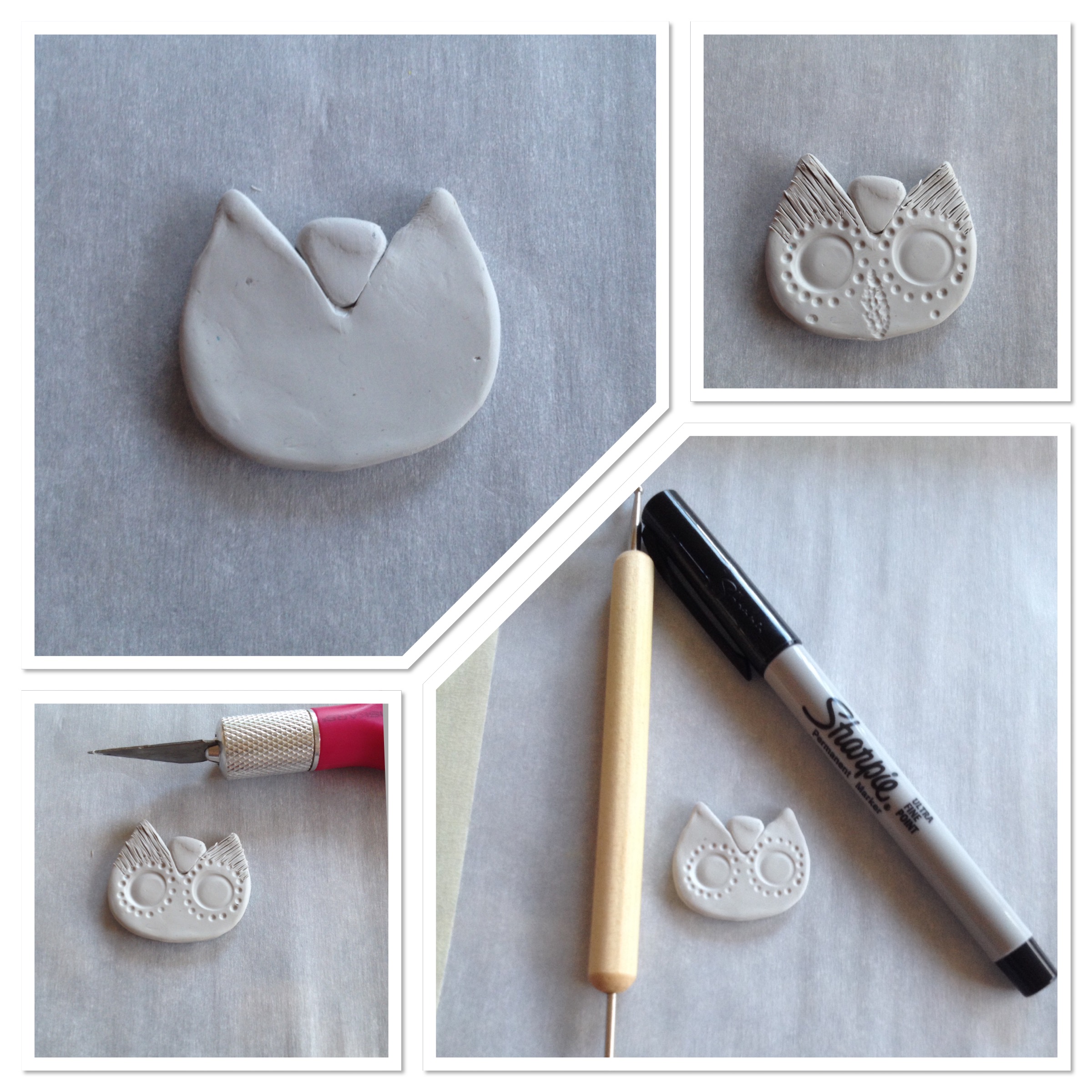 Step 2 : Take a piece of silver clay and roll it. Shape it like shown below to form the owl face. Use the marker to stamp eyes and a toothpick and knife to create some design that match the metal piece.