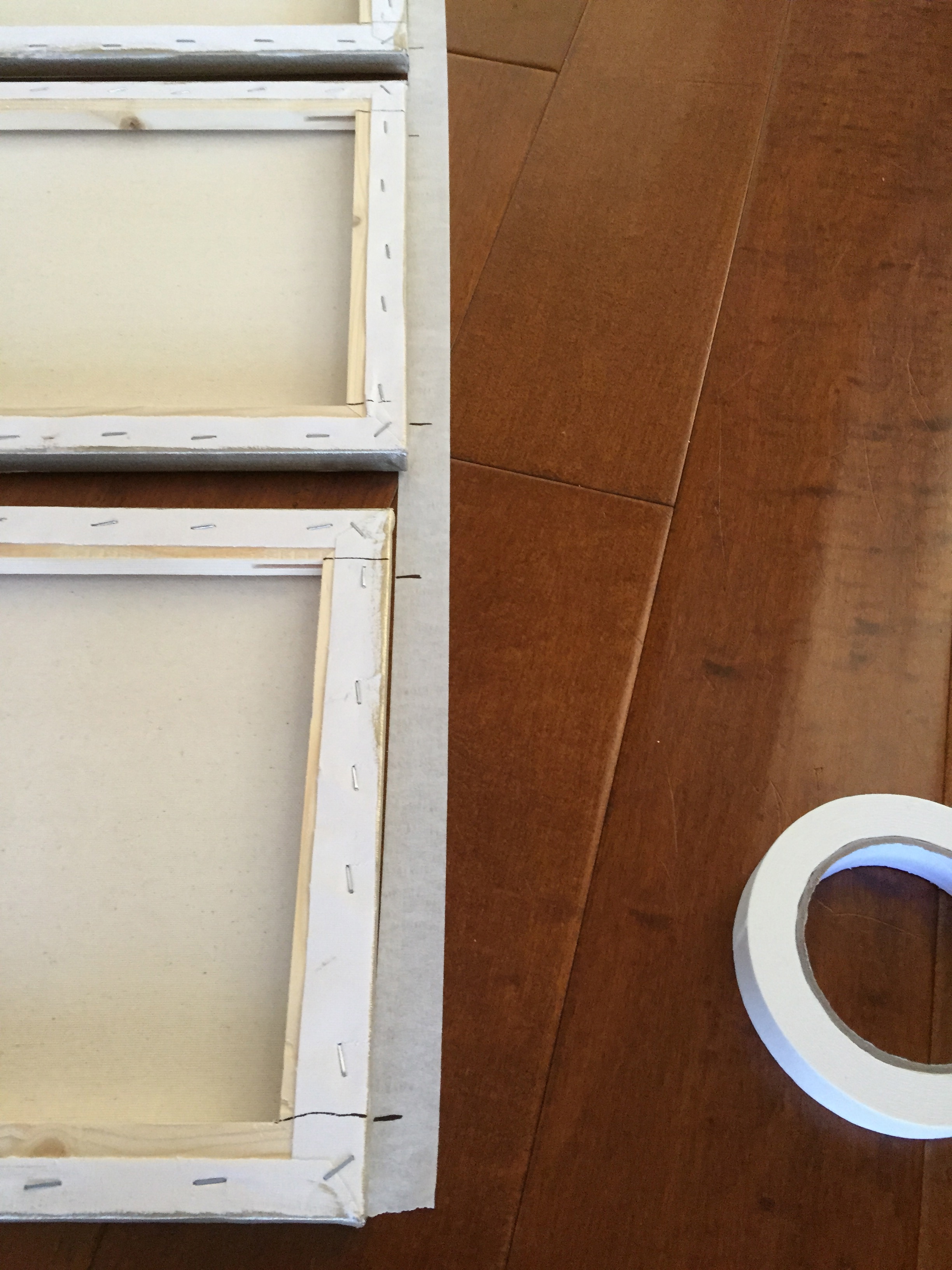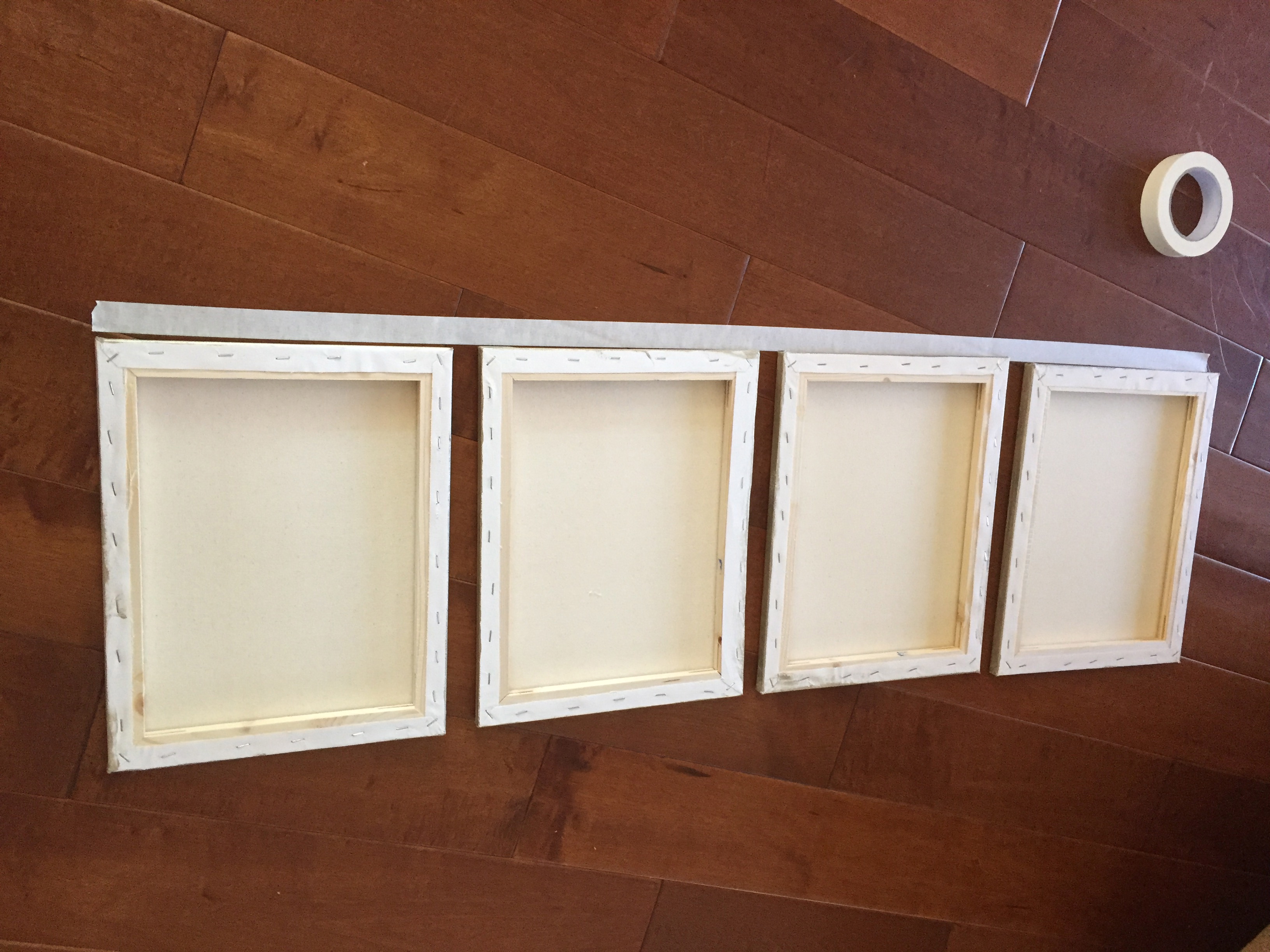 Place the frames/canvas you want to hang, upside down in the pattern of your choice. Then take an equal length of painters/masking tape and stick it along the borders.