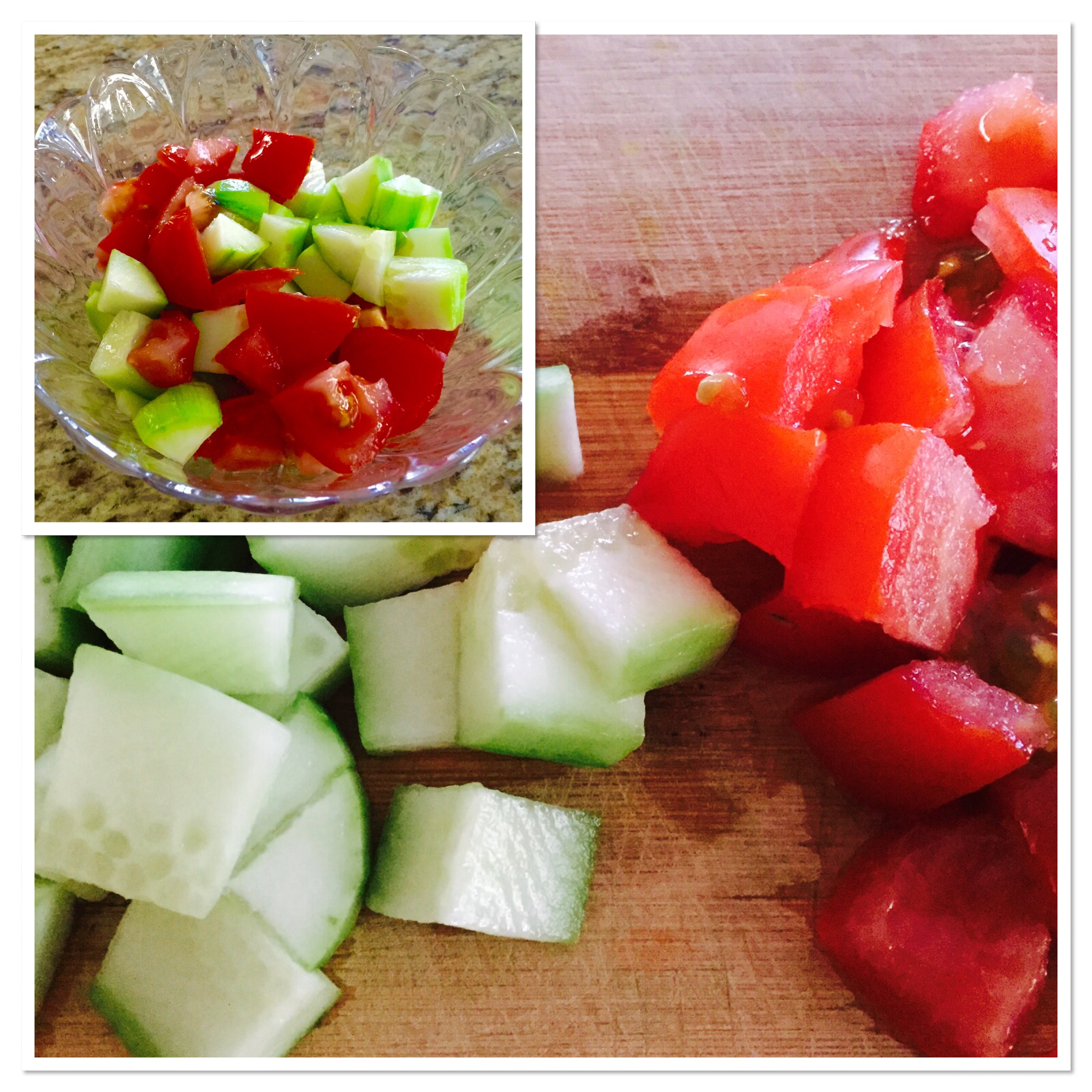 Dice tomato and cucumber (with/without peel) and transfer into a bowl