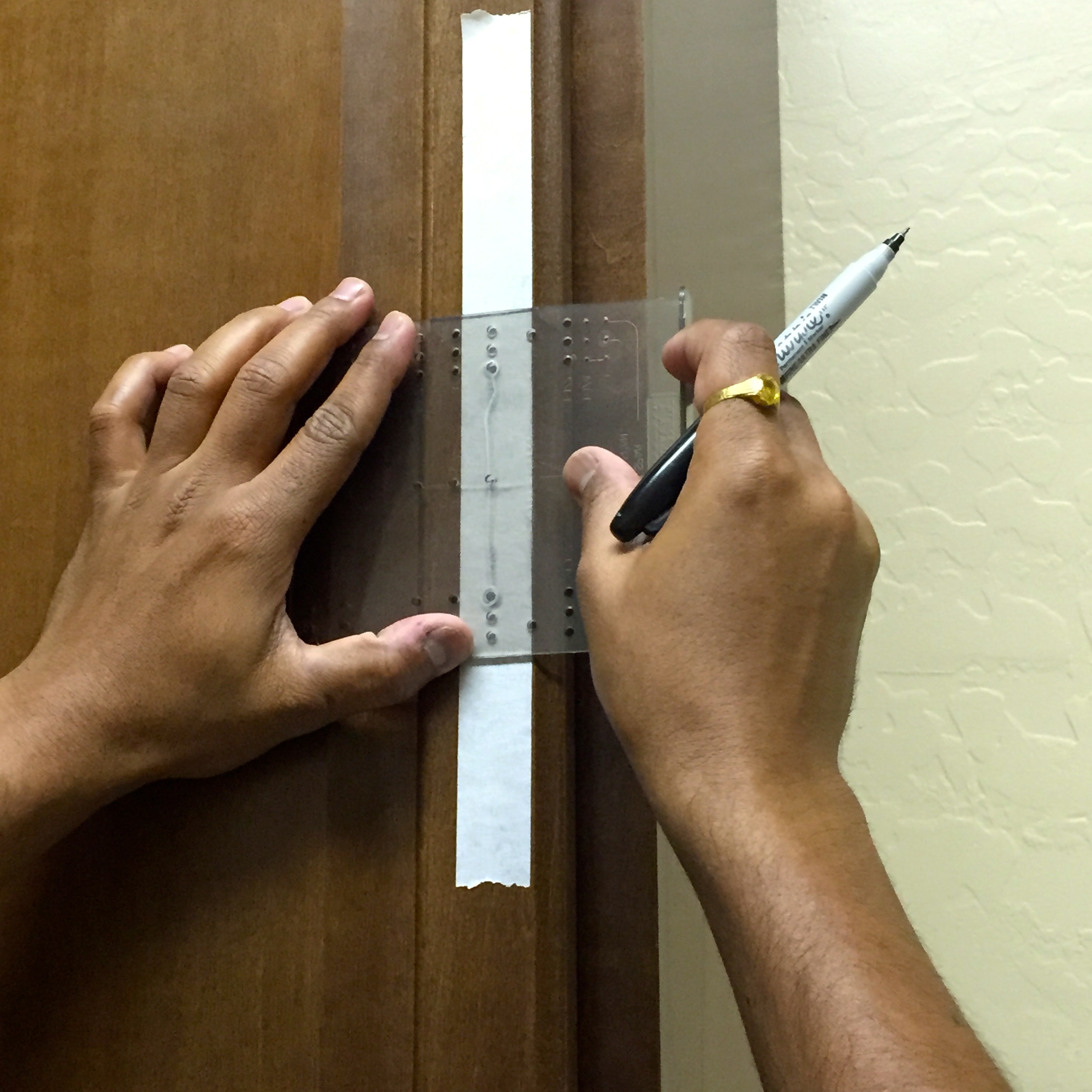 Center it and line the template up with the edges of the door and mark your hole with a pencil, make sure to use the same hole every time!