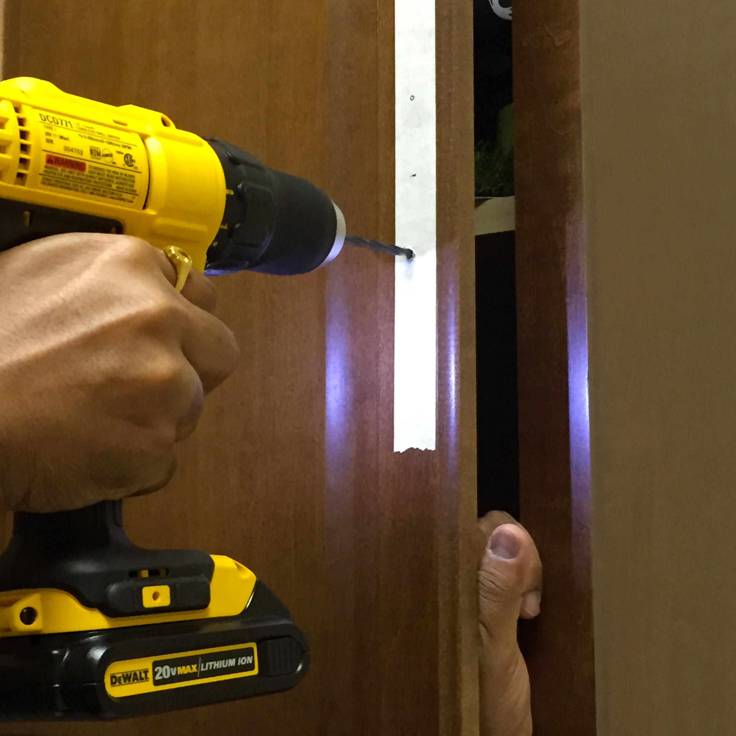 Using the drill bit from the template kit, drill through the cabinet doors/drawers.