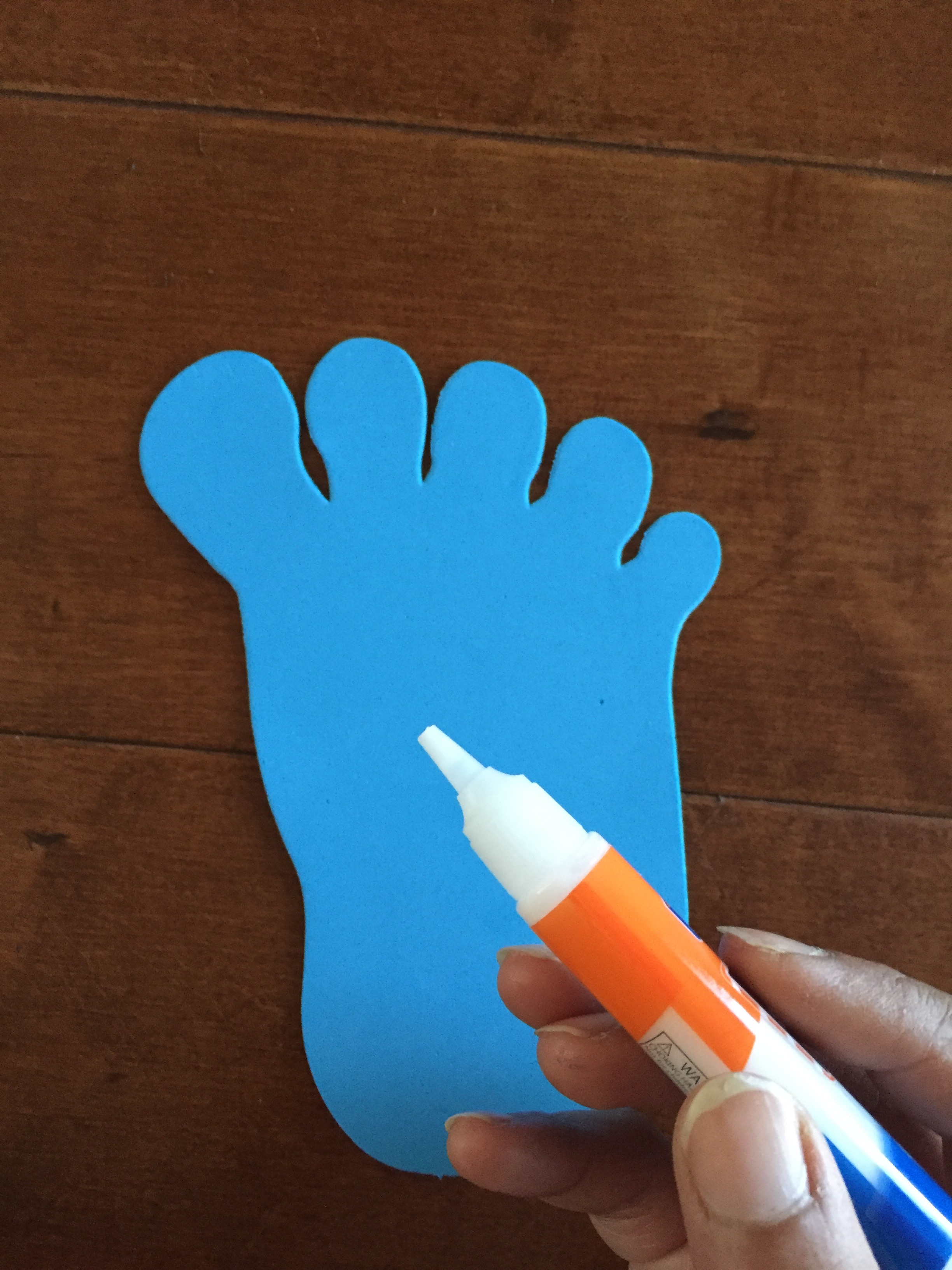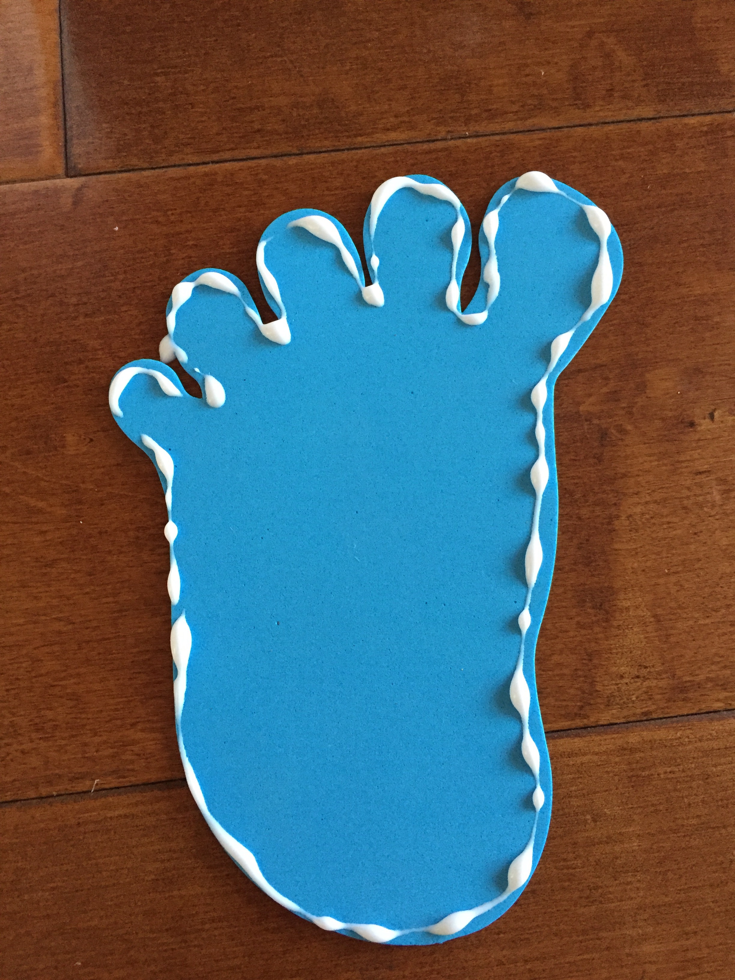 Step 1 : Add some basic school glue all along the outline of the foam feet cutout