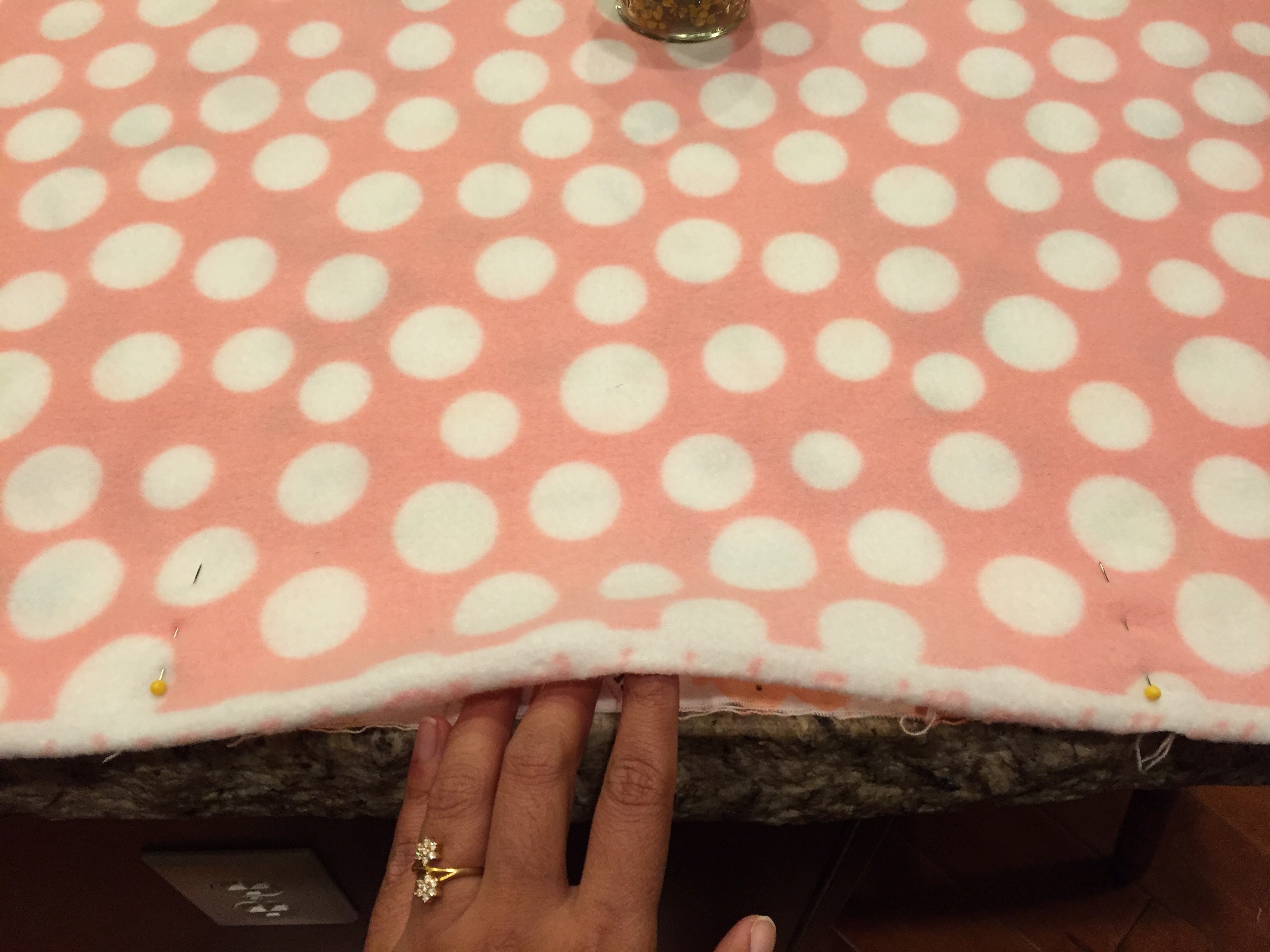 Pin around the sides leaving 8-10 inches opening so that you can turn the blanket right side out later.